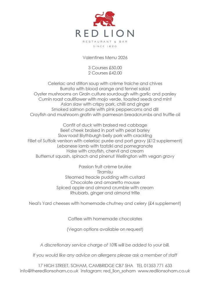 The Red Lion, Soham, is a 17th Century inn serving rustic, modern cooking using local and seasonal ingredients. Roaring fires in the winter and a lovely walled garden in the summer for Al fresco dining.
